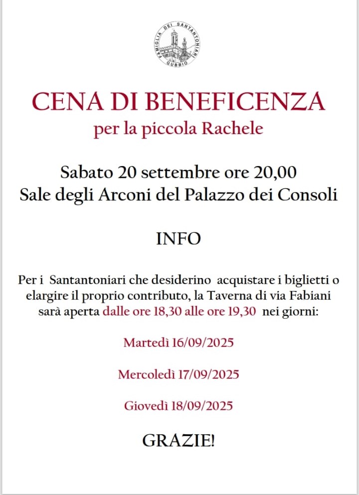 INFO CENA DI BENEFICENZA Precedente Articolo CENA DI BENEFICENZA PER LA PICCOLA RACHELE Prossimo Articolo GUBBIO HA RINNOVATO L’11 SETTEMBRE 2025 LA SOLENNITA’ DELLA TRASLAZIONE DI SANT’UBALDO