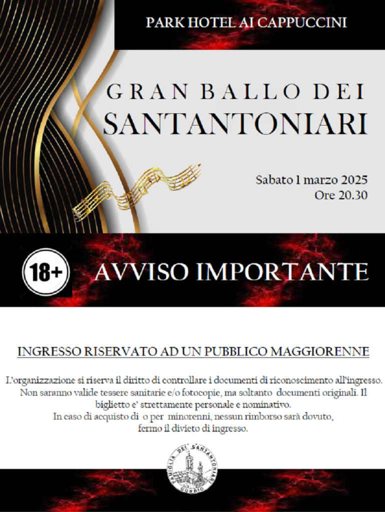 Fervono i preparativi per il Gran Ballo dei Santantoniari, che si terrà presso il Park Hotel Ai Cappuccini il 1° marzo 2025. Per motivi di sicurezza ed in base alle disposizioni sulla somministrazione di alcolici, l’ingresso è riservato esclusivamente ad un pubblico maggiorenne.