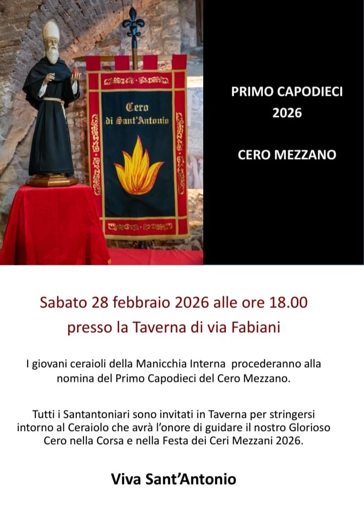 SABATO 28 FEBBRAIO ORE 18.00 TAVERNA VIA FABIANI NOMINA CAPODIECI 2026 CERO MEZZANO Precedente Articolo COMUNICAZIONE RINNOVO CARICHE SOCIALI FAMIGLIA DEI SANTANTONIARI Prossimo Articolo ALESSIO BACIOTTI PRIMO CAPODIECI 2026 DEL CERO MEZZANO